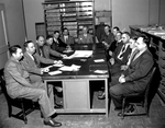 Left to right: Charley Needham, Jim McMullen, Herbert Joseph, Burdette Brants, Ray Manning, business manager J. E. Crews, of Waco, Texas, Amon Carter, manager Rupert A. Taylor, of Amarillo, Texas, Jack Lewis, Mack Clark, Herman Clark, Norman Earl and George Liser. The men are seated at a table. Some of the men have notepads and pens in front of them.