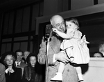 Amon Carter and his granddaughter, Shelia B. Johnson. Carter is standing in front of a microphone while carrying Sheila. He is looking at her as she plays with the microphone. There are people seated, looking on. Carter is wearing a suit and Sheila is wearing a dress. Among the audience is Carter's wife, Minnie Meacham Smith.