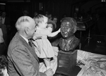Amon Carter and his granddaughter, Shelia Johnson, looking at bust statue of Amon Carter. The statue was presented to Carter by employees of Carter Publications, Inc. Carter is carrying Sheila and she is touching the statue. Sheila is also holding a comb in her right hand.