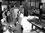 Amon Carter and family during the presentation of a bust statue of Carter, gifted to him by employees of Carter Publications, Inc. Carter is standing at a microphone, addressing a crowded room. Among the crowd are Amon Carter's daughter, Ruth Carter (Mrs. J. Lee Johnson, III), and his granddaughter, Sheila B. Johnson, daughter of Ruth Carter.