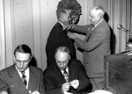 Amon Carter (right, standing) pinning a badge on John Baker (left, standing), of Armour and Company. There are two unidentified men sitting at a table in front of Carter and Baker. All four men are wearing suits and the two seated men are also wearing eyeglasses. There is a wreath decoration on the back wall.