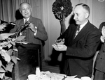 Amon Carter standing at a podium during a salesmen's banquet. An unidentified man is standing at the right, clapping. Both men are wearing suits. On the back wall is a wreath decoration.
