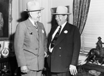 Amon Carter and V. E. (Sam) Vining attending a salesmen's banquet. Both men are wearing suits and hats. They are facing each other and smiling. On a desk, at right, is a statue of a man on a horse.