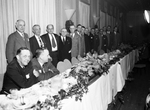 Amon Carter (far left) and others photographed during a salesmen's banquet. There are two men seated at a long dining table and the others, including Carter, are standing. On the table are plates, cups and other tableware, along with floral decorations.