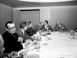 Bob Hope and Amon Carter, Sr., sitting at a dining table with a group of unidentified men. Bob is kissing a man's forehead. On the table are plates, cups and cutlery.