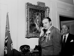 Bob Hope and an unidentified man. On the wall behind them is a framed painting. Hope is speaking on a telephone. Both men are wearing suits. Hope has a flower corsage attached to his suit jacket.