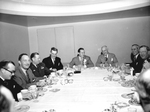 Bob Hope and Amon Carter, Sr. with group of unidentified men seated around a dining table. Bob Hope and Carter are seated at the head of the table. On the table are plates, cups and silverware.