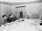 Amon Carter, Jr., Bob Hope and Amon Carter, Sr. with group of unidentified men seated around a dining table. Bob Hope and the Carters are seated at the head of the table. On the table are plates, cups and silverware. One man is standing in the background.