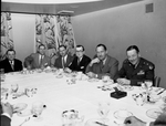 Amon Carter, Jr. (third from left), sitting at a dining table with a group of unidentified men. One of the men, at the far right, is wearing a military uniform; the other five men are wearing suits. On the table are plates, cups and cutlery. In the background is a curtain with a floral pattern.