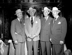 Amon Carter, Sr. (far left), standing next to three unidentified men. All four men are wearing suits and hats and are smiling.