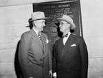 Amon Carter and Edwards H. Butler, of Buffalo, New York, standing in front of a plaque. Both men are wearing suits and hats. They are facing each other and smiling. Butler is also wearing eyeglasses. The plaque on the wall lists members of the Fort Worth Club Honor Roll.