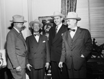 Amon Carter, Sr., with Associated Press executives Edward H. Butler, Frank J. Starzel and Alan J. Gould. The men are wearing suits and hats. Butler is wearing eyeglasses. The men are standing in a room with a framed painting on the back wall, framed photograph on a side table, and a desk with a statue of a man on a horse.