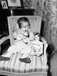 Shelia B. Johnson, daughter of Mr. and Mrs. J. Lee Johnson 3. Sheila is seated on a cushioned stripped chair with a doll beside her and another doll in her hand. She also has some of her left fingers in her mouth. She is wearing an overall with a long sleeve shirt and snickers. In the background, there is a curtain with floral patterns and a table with framed photographs.