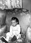 Shelia B. Johnson, daughter of Mr. and Mrs. J. Lee Johnson 3. Sheila is seated on a couch with floral pattern. She is wearing an overall with a long sleeve shirt and snickers. She has both hands on her left leg . She has her face slightly facing sideways as she looks straight ahead.