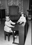 Shelia B. Johnson, daughter of Mr. and Mrs. J. Lee Johnson 3.Sheila is seated on a stool playing her little piano in the living room. There is a female doll seated on the piano She has her head tilted towards the camera. She is wearing a long sleeve overall with snickers. In the background, there is a statue of a dog, a cushioned chair, and a floral curtain covering the window.