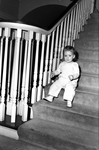 Shelia B. Johnson, daughter of Mr. and Mrs. J. Lee Johnson 3. Sheila is seated on a step of the staircase with rails. She has her arms slightly raised in front of her. She is wearing a long sleeve overall with snickers