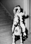 Shelia B. Johnson, daughter of Mr. and Mrs. J. Lee Johnson 3.Sheila is sitting atop a toy horse. She has her arms stretched out signaling for something.She is wearing a long sleeve overall with snickers