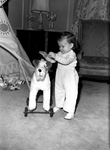 Shelia B. Johnson, daughter of Mr. and Mrs. J. Lee Johnson 3. Sheila is standing in a room playing with her stuffed toy dog on wheels. She is wearing a long sleeve shirt and an overall with snickers. There is a table with a lamp and candle sticks, a cushioned chair and a partial view of a tent with dolls laying underneath in the background.