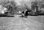 Mr. and Mrs. Amon Carter Senior and Amon Junior in snow. The Carters are standing outdoors in the snow in front of trees and a house. Mr. and Mrs. Carter Senior are standing together while Amon Jr. is squatting in front of them while petting the dog. There is a car parked at a distance in the background.