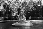 Shots of the Carter house and grounds in snow. A shot of the water fountain at the carter house. There is a statue of a naked person seated at the center of the fountaon. In the background, there is a tree with the branches full of snow and some outdoor chairs and benches