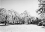 Shots of unidentifed house and grounds. A view of nature with trees and the ground covered in snow.