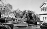 Shots of unidentified house and grounds. A zoomed out view of a water fountain with a seated statue in the middle surrounded by trees with snowy branches and outdoor benches. There is also a side view of a multi- story house with divided lite windows.