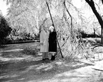 Shots of unidentified house and grounds. Mr. and Mrs. Carter standing outdoors close together in the snow underneath a tree with fallen snowy branches. The couple are wearing overcoats on their outfits. They are both looking towards the camera and smiling.