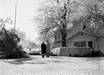 Shots of unidentified house and grounds. A shot taken at a distance of Mr. and Mrs. Carter standing outdoors close together in the snow underneath a tree with snowy branches. They are in front of a house. The couple are wearing overcoats on their outfits.
