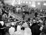 "Kilroy returns," Aberdeen-Angus steer in the ring. Looking at him are, Left to right, W. R. Watt, Robert H. Johnson, Amon Carter and J. W. Mitchell. A photograph of groups of people looking at the Aberdeen Angus Steer from behind the ring with a few people in the ring.