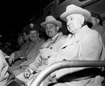 Amon Carter and two guests sitting at the Southwestern Exposition and Fat Stock Show. Left to right, Major General Roger M. Ramey, LaMotte T. Cohu and Amon Carter.