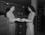 Five steps of veterans' disability claims at Veterans Administration: Second step, Franklin Farnsworth receives completed files with assigned claim numbers from typist Louise Potts, 02/07/1946