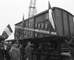 French Merci train with French, Texas, and U.S. flags, sent in gratitude of the French people for Texas Friendship Train sponsored by Texas Lions Clubs, Amon G. Carter Foundation, and Santa Fe Railway Company, 02/14/1949
