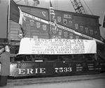 French Merci train with French, Texas, and U.S. flags, sent in gratitude of the French people for Texas Friendship Train sponsored by Texas Lions Clubs, Amon G. Carter Foundation, and Santa Fe Railway Company, 02/14/1949 (man at left may be John Honts)