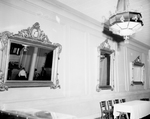 Mirrors at Brinkley home. There are three different size mirrors arranged on the wall. There are images of people in the room reflected in the mirror. There is a chandelier on the ceiling and a rectangular table with chairs at the front.