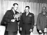 General Vandenberg, General Ramey, and Amon Carter Senior. Gen. Vandenberg is wearing his military uniform. He is holding a golden horse statue presented to him by Mrs. Carter. Gen. Ramey is looking at the horse and smiling while Amon Carter looks ahead. Amon Carter is wearing a suit while Gen. Ramey is in his uniform. There is a window with curtains in the background .,