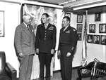 Carter, Vandenberg and Ramey. The three men are standing together indoors having a conversation. Vandenberg and Ramey are dressed in their military uniform while Carter is wearing a suit and tie. There are framed portrait photograph of service men in their uniform on the wall . In the background there is a flowery curtain and chairs .