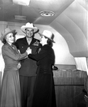 Mrs. Amon Carter Senior, Vandenberg and Mrs. Vandenberg . Gen. Vandenberg is standing between both women. The women have their palms together in front of Gen. Vandenberg's chest. They all smile as they pose for the camera. Gen. Vandenberg is wearing his military uniform while the women are dressed in suit jackets with skirts , an inner blouse and a hat