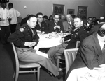 Shots made at dinner at River Crest. Groups of unidentified men seated at different dinner tables with plates of food and drinks in front of them. Some of the men are wearing military uniform while others are dressed in suit and tie. There are waiters going around and serving the food.