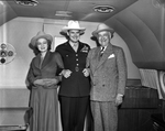 Mrs. Carter, General Vandenberg, Amon Carte. Gen. Vandenberg is standing between the Carters and has his hands cross linked with theirs. He is wearing his military uniform while Mr. Carter is dressed in a suit with pants and Mrs. Carter is wearing a suit with skirt. They are all wearing hats.