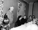 Dinner in honor of Reverend of Notre Dame University. Dinner in honor of Reverend of Notre Dame University. There is a group of unidentified people seated at a rectangular table having a meal, there are plates of food and cups. There are also candles lit in a row at the center of the table and flower center pieces . The guest are dressed in formal attires and the reverend is in his uniform. Amon Carter is standing in front of the table and the people seated are watching him