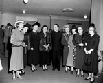 Dinner in honor of Reverend of Notre Dame University. A group of women standing together in an arch wearing different outfits with the reverend in their middle wearing his uniform
