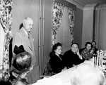 Dinner in honor of Reverend of Notre Dame University. There is a group of unidentified people seated at a rectangular table having a meal, there are plates of food and cups. There are also candles lit in a row at the center of the table. The guest are dressed in formal attires and the reverend is in his uniform. Amon Carter is standing in front of the table and the people seated are watching him