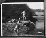 Copies of paintings in Carter Collection. A painting of people swimming naked in a river. Some of them are diving in.