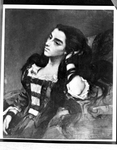 Copies of paintings in Carter Collection. A painting of a woman seated in a chair. She is resting her head on her hand which is placed on the chair. She has her flowing down past her shoulders. She is wearing a stripped dress with a ruffled collar.
