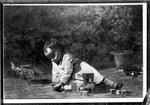 Copies of paintings in Carter Collection. A painting of a baby playing with toys.The baby is wearing a dress and stripped socks with shoes. Some of the toys include letter blocks and a wagon