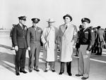 Left to right, General Hoyt S. Vandenberg; Amon Carter; Stuart Symington, Air Secretary; and Major General Roger Ramey. The men are standing together in a row at the apron. Mr. Carter and Mr. Symington are wearing an overcoat on top of their suit and tie with a hat while the other three men are in their military uniform. There is an unidentified man standing beside Gen. Vandenberg. In the background, there is a group of people standing behind them and a plane in the far distance.