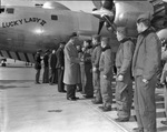 Secretary for Air Symington greeting 14 crewmen of "Lucky Lady II" at Carswell Air Force Base , after first non-stop flight around the world, 8th AF B-50 bomber, 03/03/1949