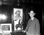 David E. Finley, director of National Gallery of Art at Washington. Mr. Finley is wearing an overcoat over his suit and tie. He is standing in Amon Carter's office beside a framed picture of Will Rogers on the wall, a statue of a man riding a horse and a framed photograph of Amon Carter Jr. on a desk. He is smiling as he poses for the picture.
