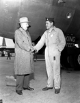 Amon Carter Senior, left and Captain Roy R. Showlater, plane commander. Mr. Carter is shaking hands with Capt. Roy in front of a plane at the apron. Mr. Carter is wearing an overcoat with pants, a scarf and a hat while Capt. Roy is wearing a long sleeve overall and a cap. There is a bag beside Mr. Carters feet and a man walking at a distance in the background.