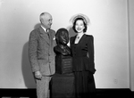 Amon Carter Senior and Electra Waggoner Biggs with Carter bust. Electra is standing beside a bust statue of Amon Carter Sr. placed on a stand while Mr. Carter Sr. stands on the other side of the statue. Electra is wearing a beaded necklace, suit jacket, skirt and a hat with net while Mr. Carter is wearing a suit and tie. Mr. Carter looks at Electra while she looks towards the camera and smiles fully showing her teeth.
